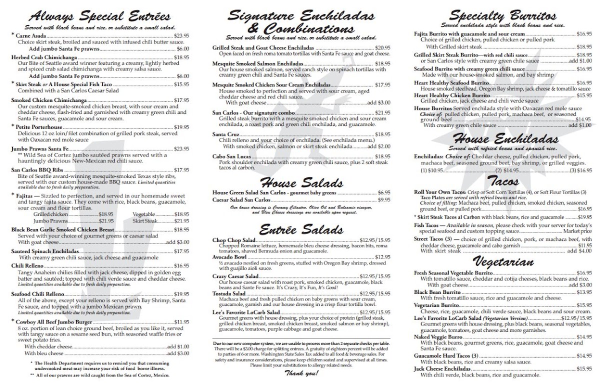 chili relleno and your choice of enchilada. with smoked chicken, salmon or skirt steak enchilada add-$2.00